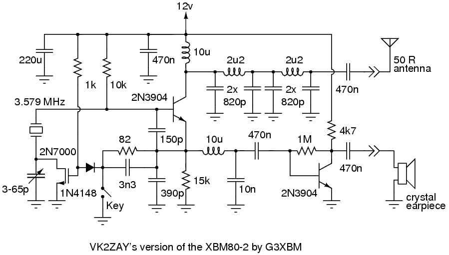 In the end, I settled on 680pF capacitors with the 1uH inductor. There is still quite a steep hump below the cut-off frequency but I'm only concerned with the performance at 7.030MHz where the SWR is 1.2:1, which I don't think is too bad. The cut-off curve of this one stage filter seems as steep as the two-stage one VK2ZAY used on 80m so I think one stage of filtering will do.After I'd written the above, the thought occurred to me to try the low pass filter in the circuit while it was on the breadboard. I'm glad I did, because I'd have been disappointed to find after soldering everything into place that the output power had fallen from 100mW to 25mW. After a bit of experimentation, it appears that connecting the low pass filter directly to the collector of the first transistor as VK2ZAY did in his version of the transceiver loads the circuit and reduces both transmit power and receive sensitivity. The solution seems to be to couple the transistor to the filter using a small value capacitor - I found 180pF gave the best results. This removes the need for the DC blocking capacitor on the output. The power is still down quite a lot, but part of this may be due to all the harmonic energy which is now not making it through to the power meter.